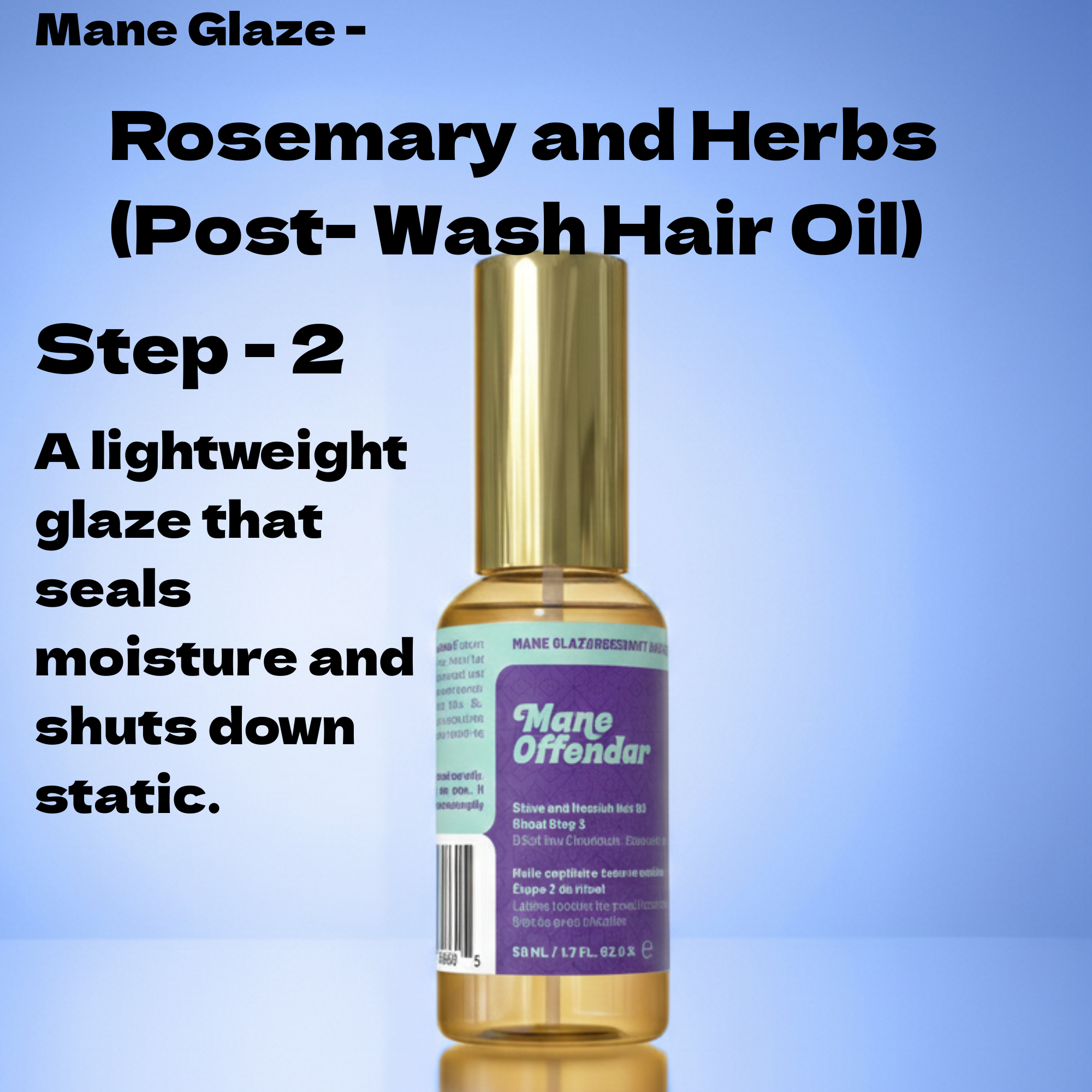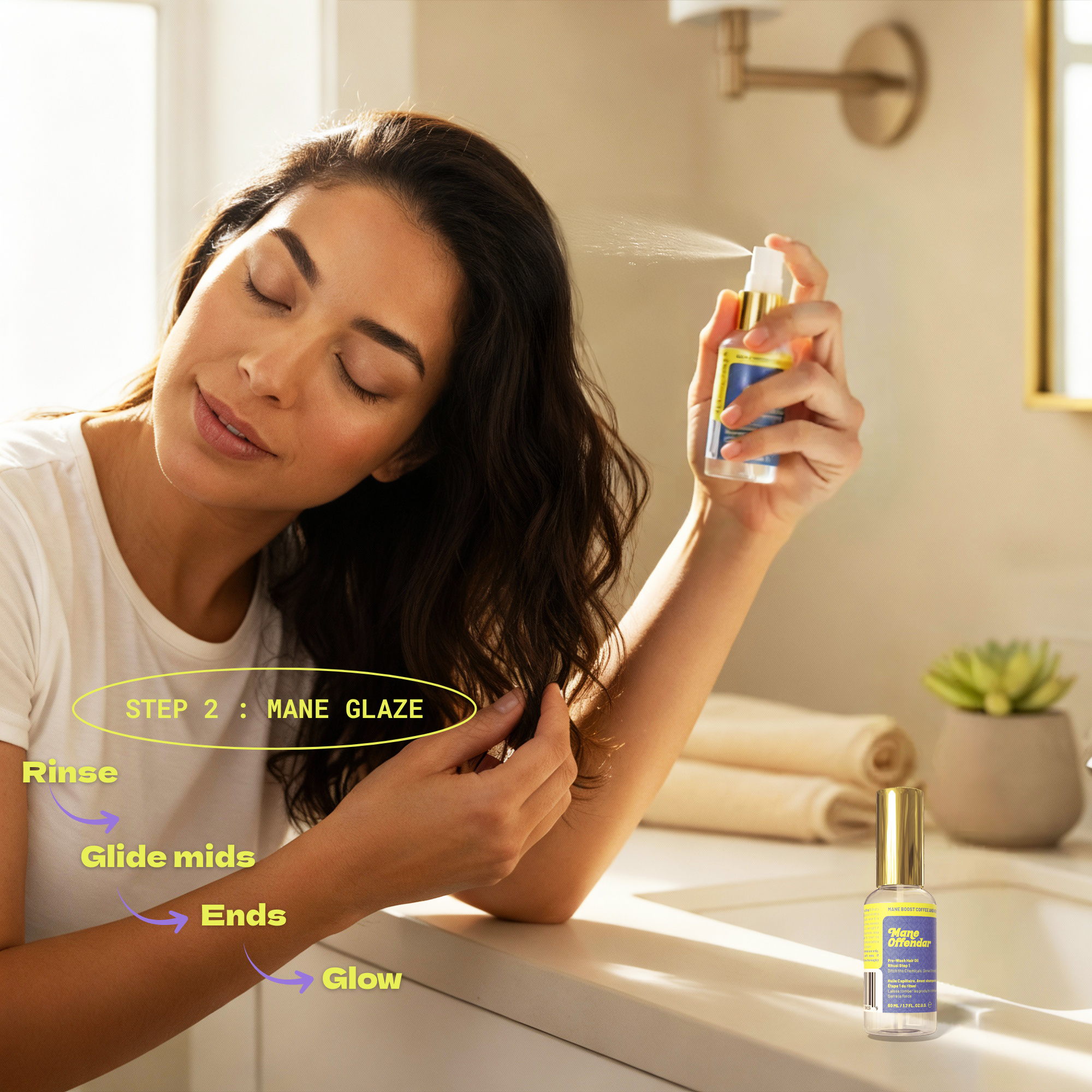 Step 2: Mane Glaze (Post-wash) - Apply to mids and ends (Damp or dry). 2–3 Spray. Nourish, Seal + shine.