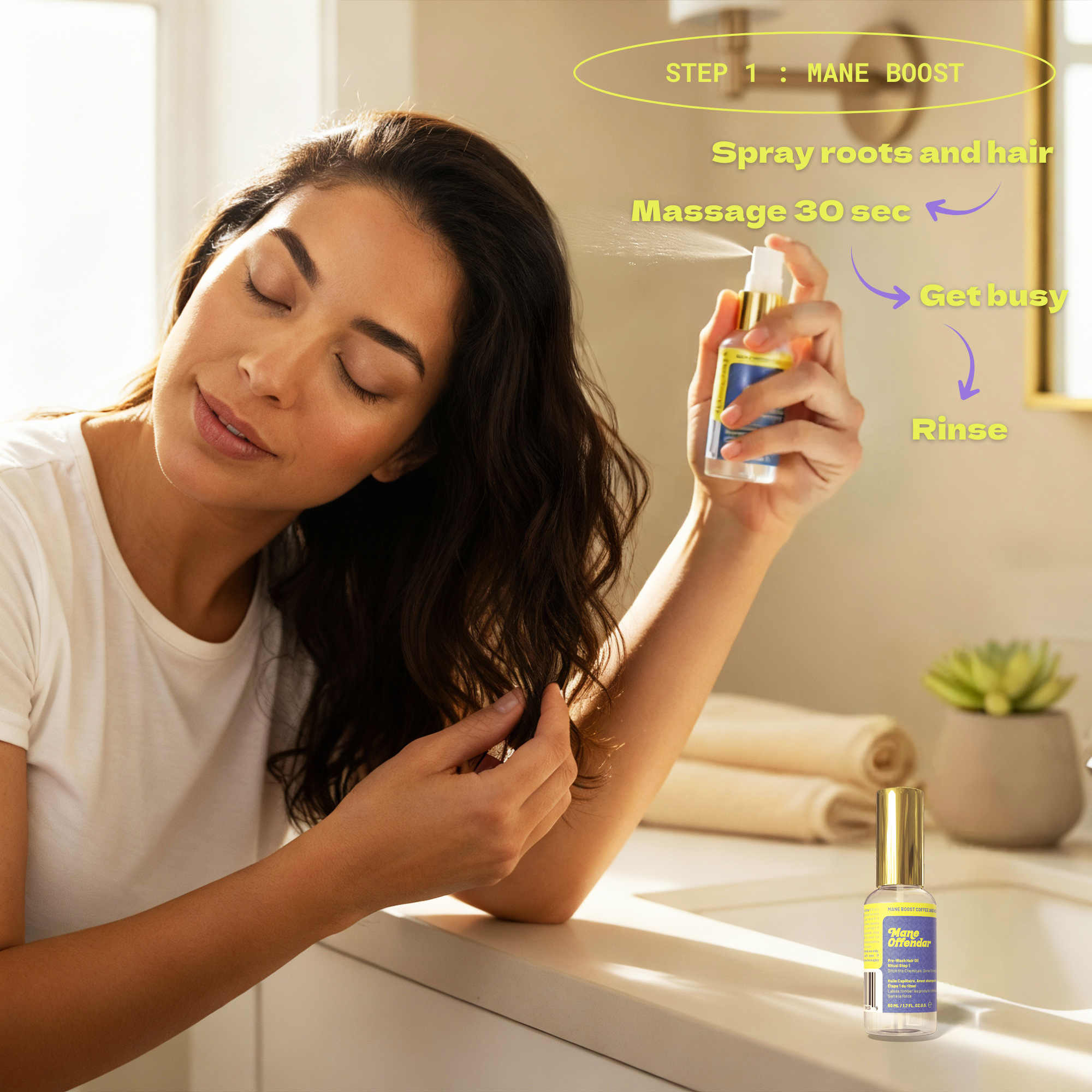 Step 1: Mane Boost (Pre-wash) - Spray on scalp and hair. Massage 30 sec. GET BUSY. Rinse.
